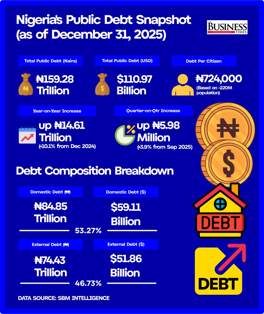The DMO’s breakdown shows that domestic debt remains the largest component at N84.85 trillion, or 53.27 per cent of the total, with the Federal Government holding N80.49 trillion and states and the FCT accounting for N4.36 trillion. External debt stood at N74.43 trillion ($51.86 billion), representing 46.73 per cent. The debt stock rose from N153.29 trillion in September 2025 to N159.28 trillion in December 2025, a quarterly increase of 3.9 per cent, and is expected to climb further after factoring in the recently approved N8.3 trillion borrowing from the UAE and UK Export Finance.